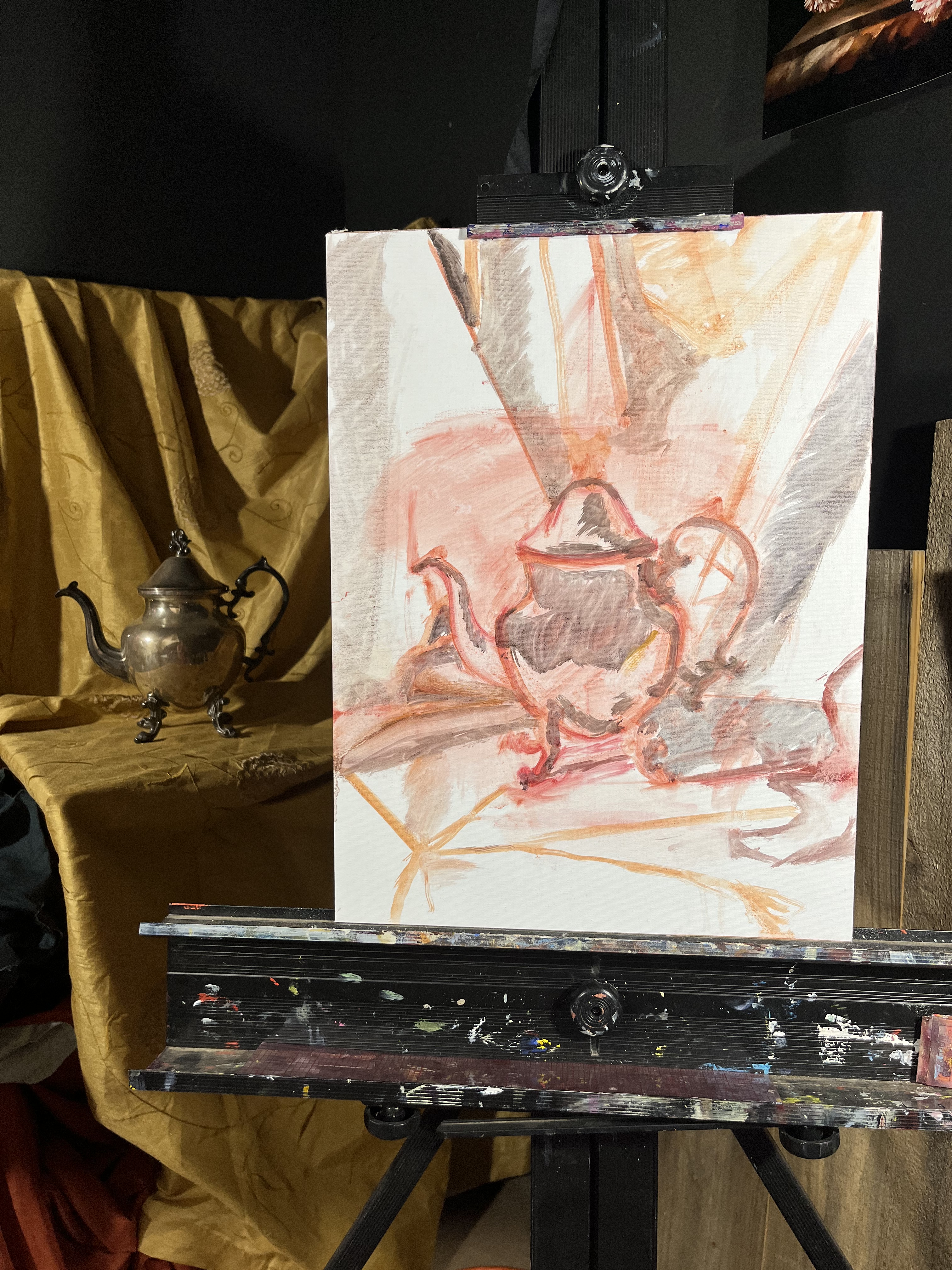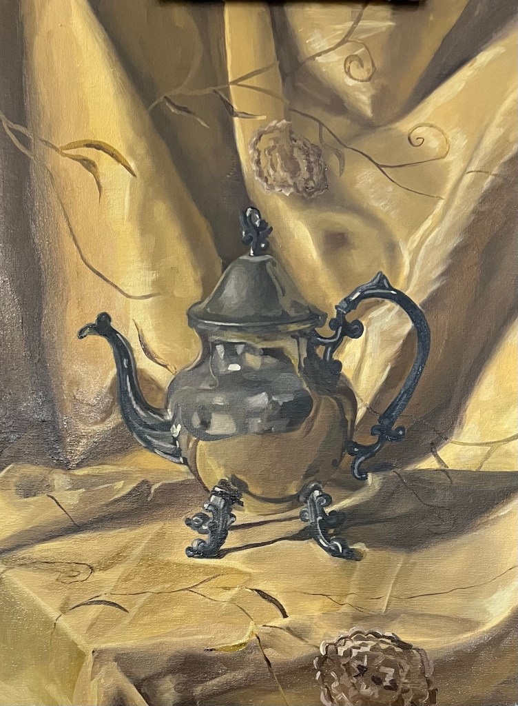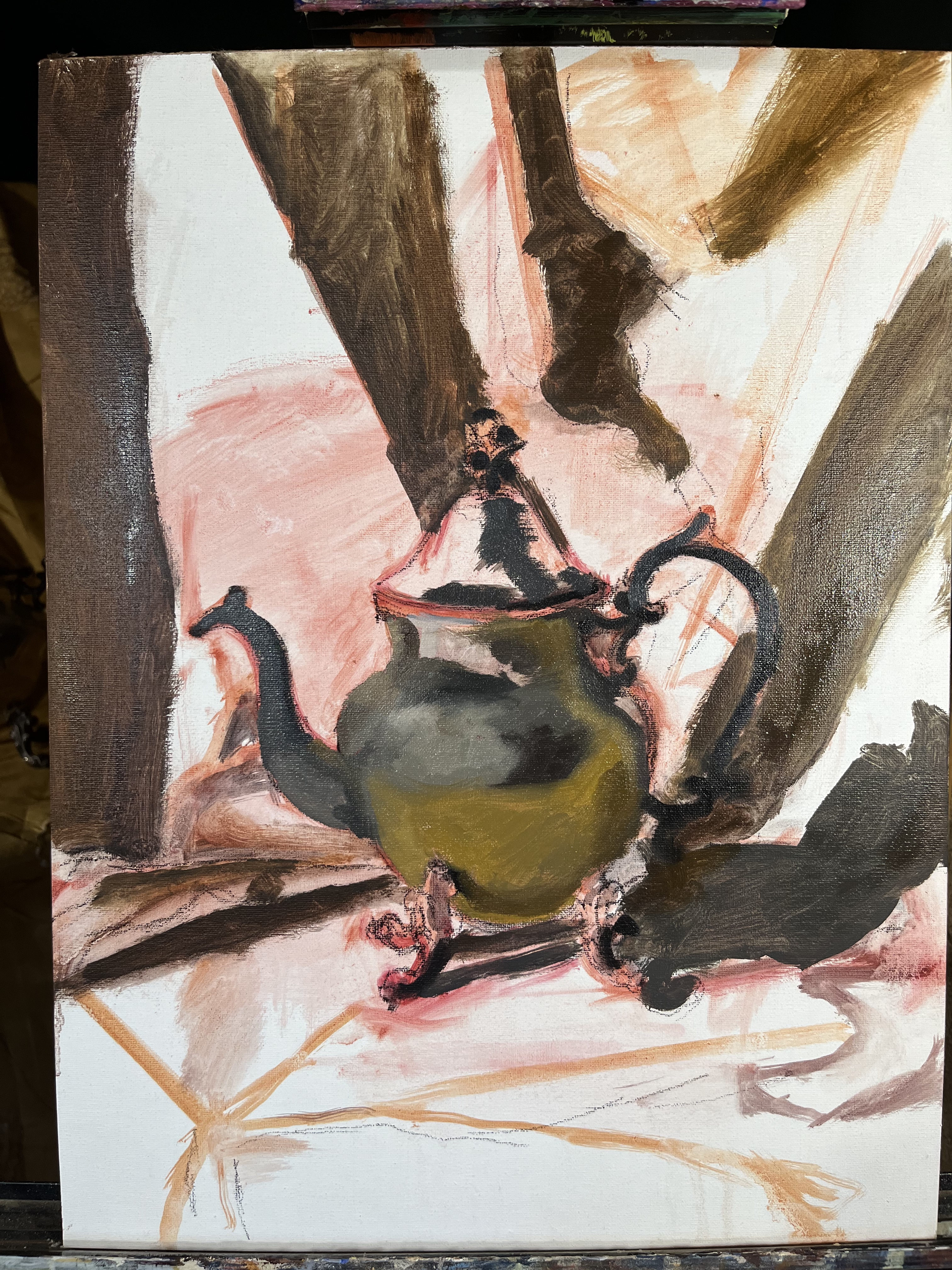 When I set up this still life I was afraid. The teapot seemed so beyond me, so difficult and complicated. At the end of the journey I feel absolutely liberated because I no longer hold thoughts of too difficult in my head. I’ve reached a beautiful plateau in my skills where I no longer look at the painting in front of me an evaluate the struggle I’m facing. I simply pick up the brush and start from the beginning.